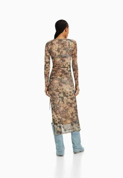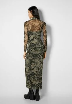 BERSHKA Long Sleeve – Maxi-Jurk – Mottled Dark Brown
