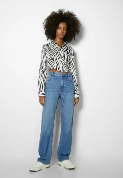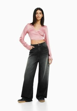 BERSHKA Long Sleeve Crossover – Cropped – Overhemdblouse – Off White