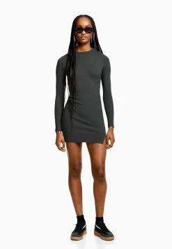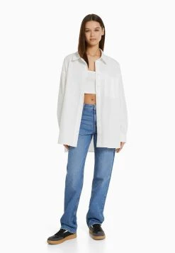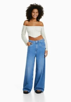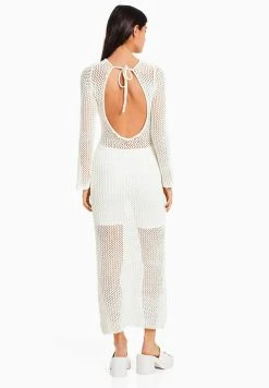 BERSHKA Long Sleeve Textured Off-The-Shoulder – Blouse – Beige