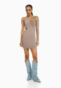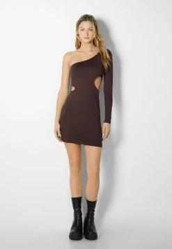 BERSHKA Asymmetric Long Sleeve Cut Out 00485831 – Etui-Jurk – Mottled Dark Brown
