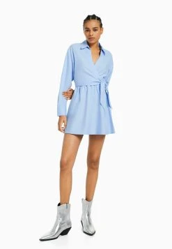 BERSHKA Crossover Detail- Mini Long Sleeve- Blousejurk – Light Blue